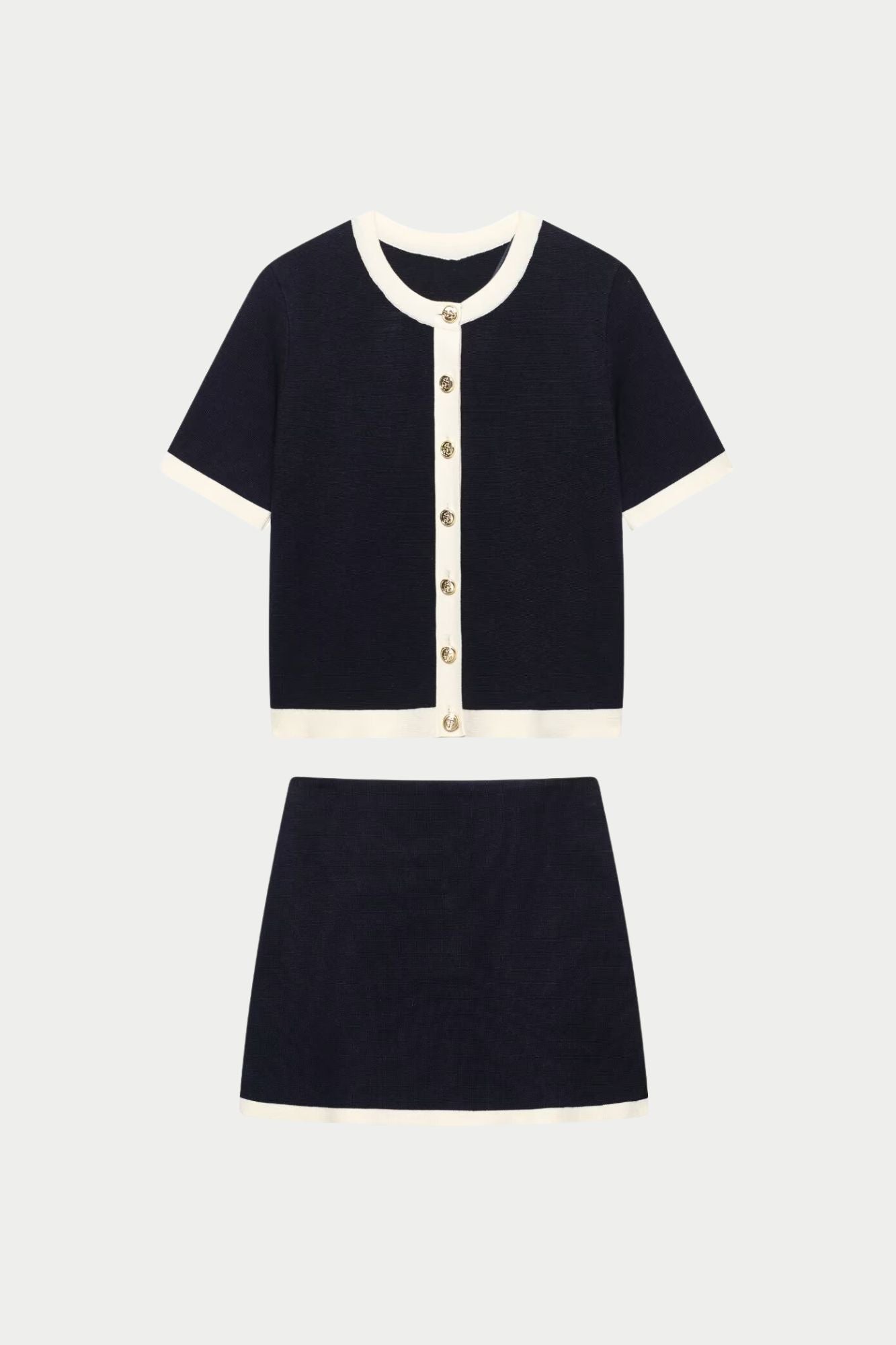 - Parte inferior: Mini saia de cintura alta, que valoriza a silhueta