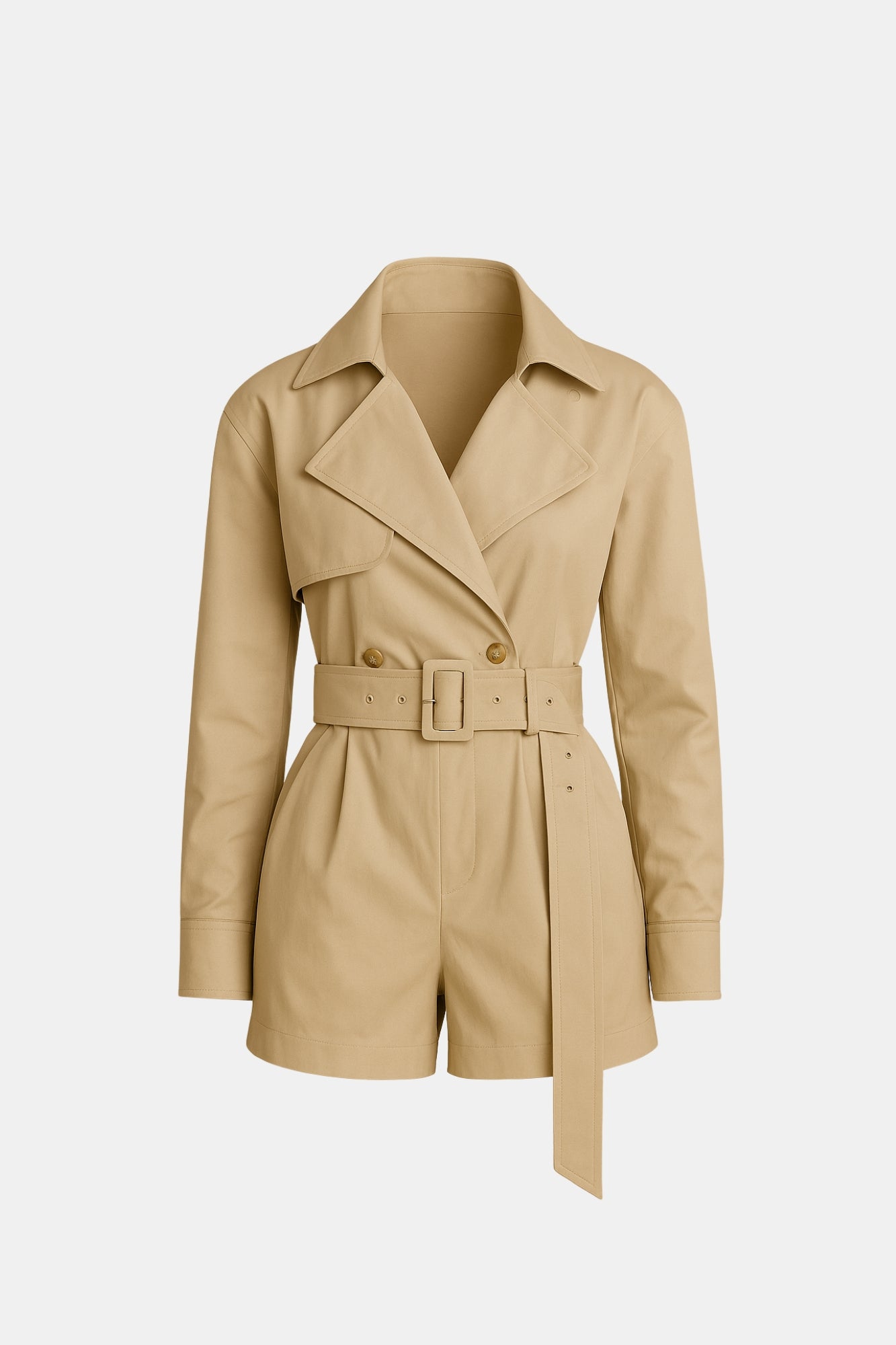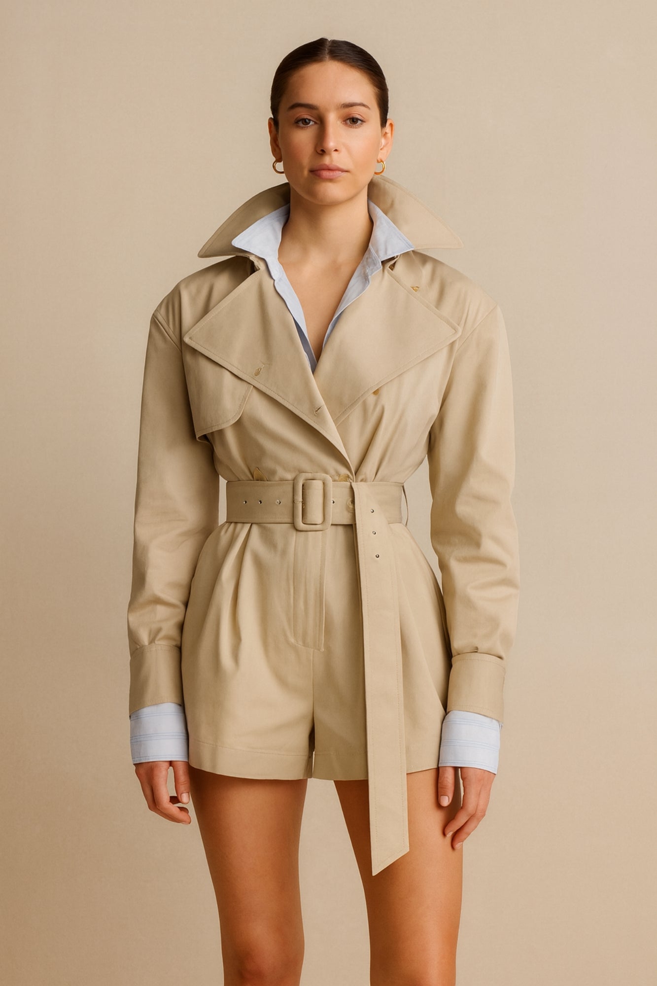 Um design sofisticado que une a elegância do trench coat clássico ao frescor do macacão curto. Confeccionado em Cotton, oferece estrutura impecável, caimento polido e conforto ao vestir.