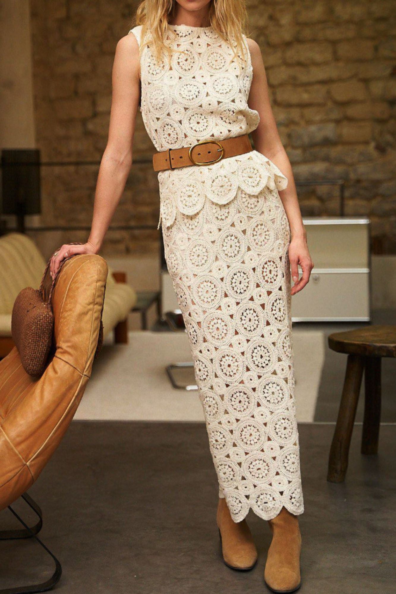 Saia Tereza confeccionada em crochê delicado, une charme artesanal e estilo sofisticado para compor looks únicos.
