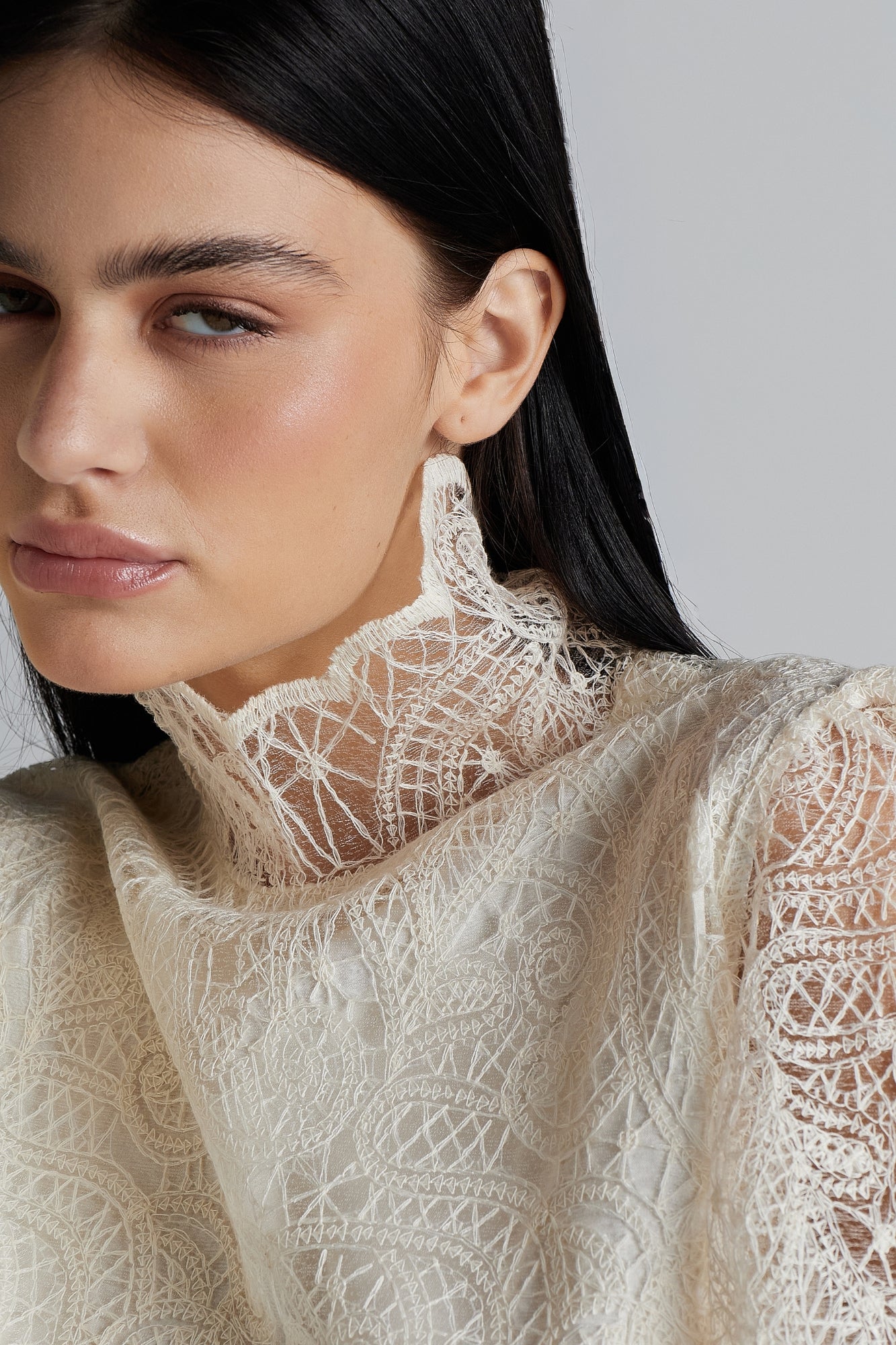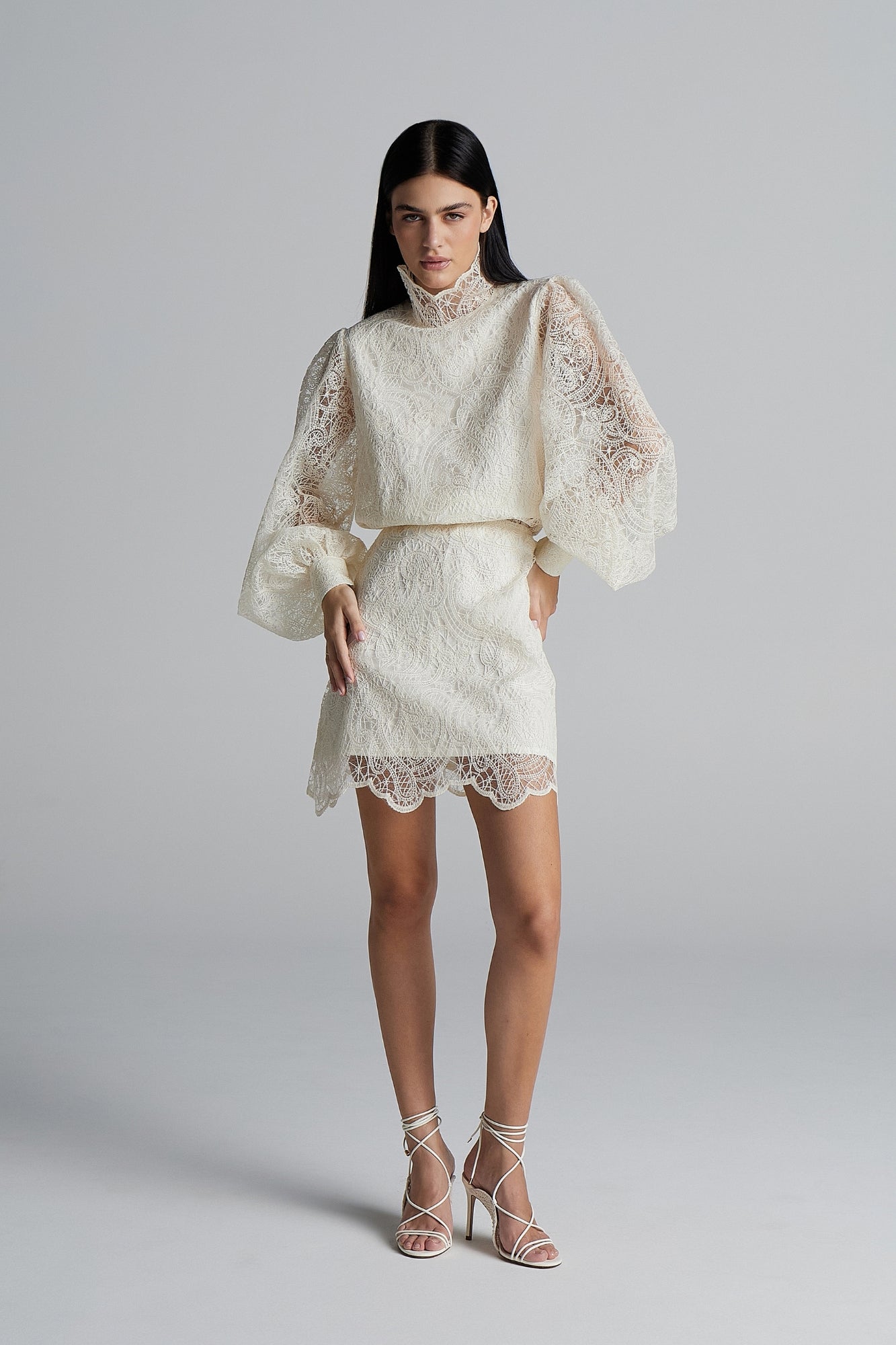 O Conjunto Aurora é a tradução perfeita da sofisticação romântica. Confeccionado em um tecido rendado delicado com forro em algodão, garante conforto sem perder a leveza e a feminilidade. As mangas bufantes com botões charmosos nos punhos e a gola alta sofisticada dão um toque de requinte e tornam o conjunto ideal para ocasiões especiais.