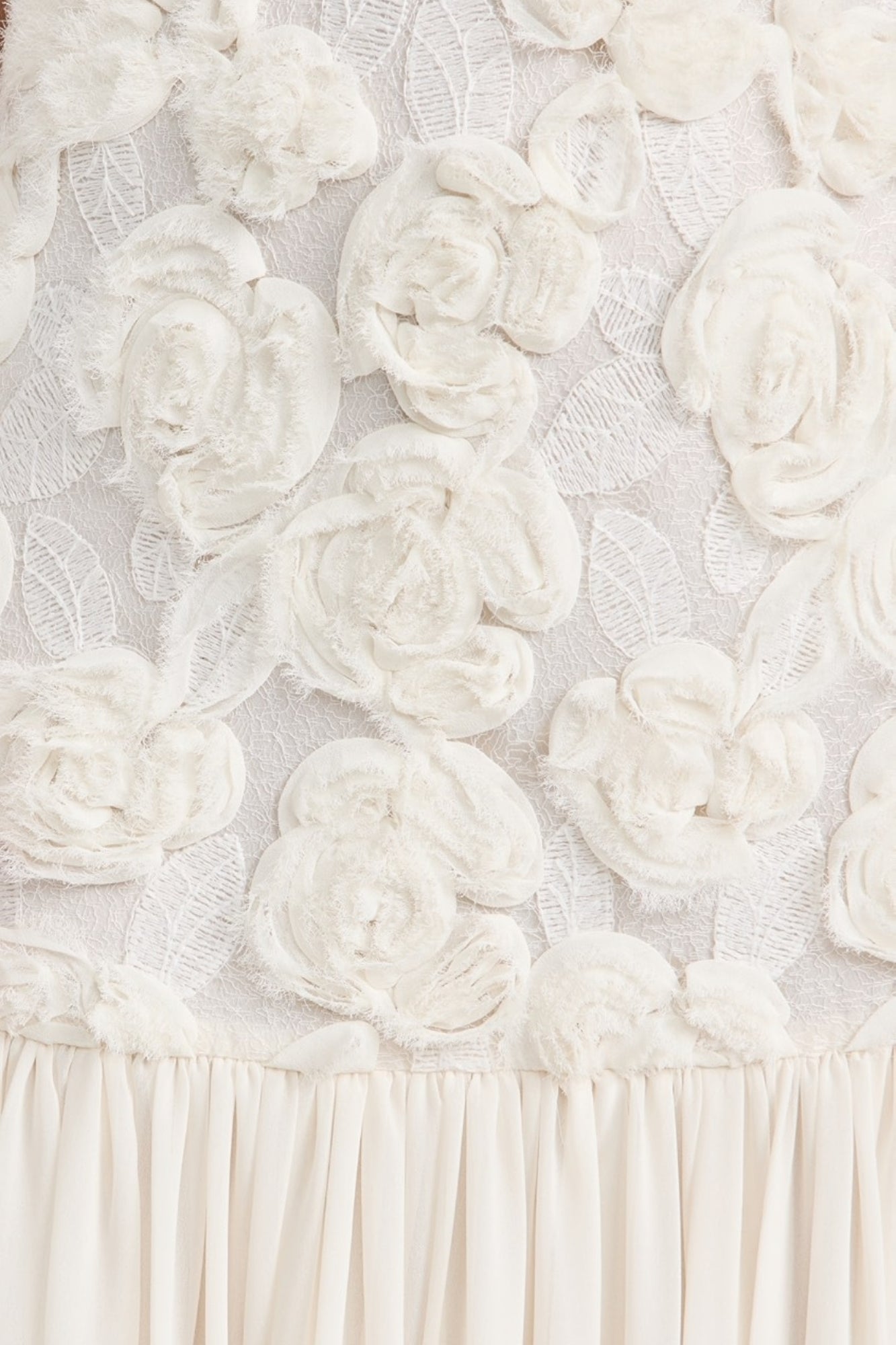 Vestido Kate: um encontro de tendências e elegância. Com seu charme de cintura baixa em alta, a parte superior apresenta flores delicadamente bordadas, enquanto a saia plissada acrescenta movimento e sofisticação.